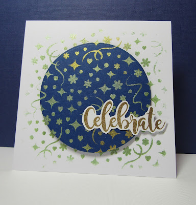 I stippled through the stencil with shimmer paints on dark blue card and cut it with a circle die. I did the same on the white card base and popped the circle up on foam tape. The sentiment is gold embossed - it is from the Birthday Sentiments set that was in the last release.