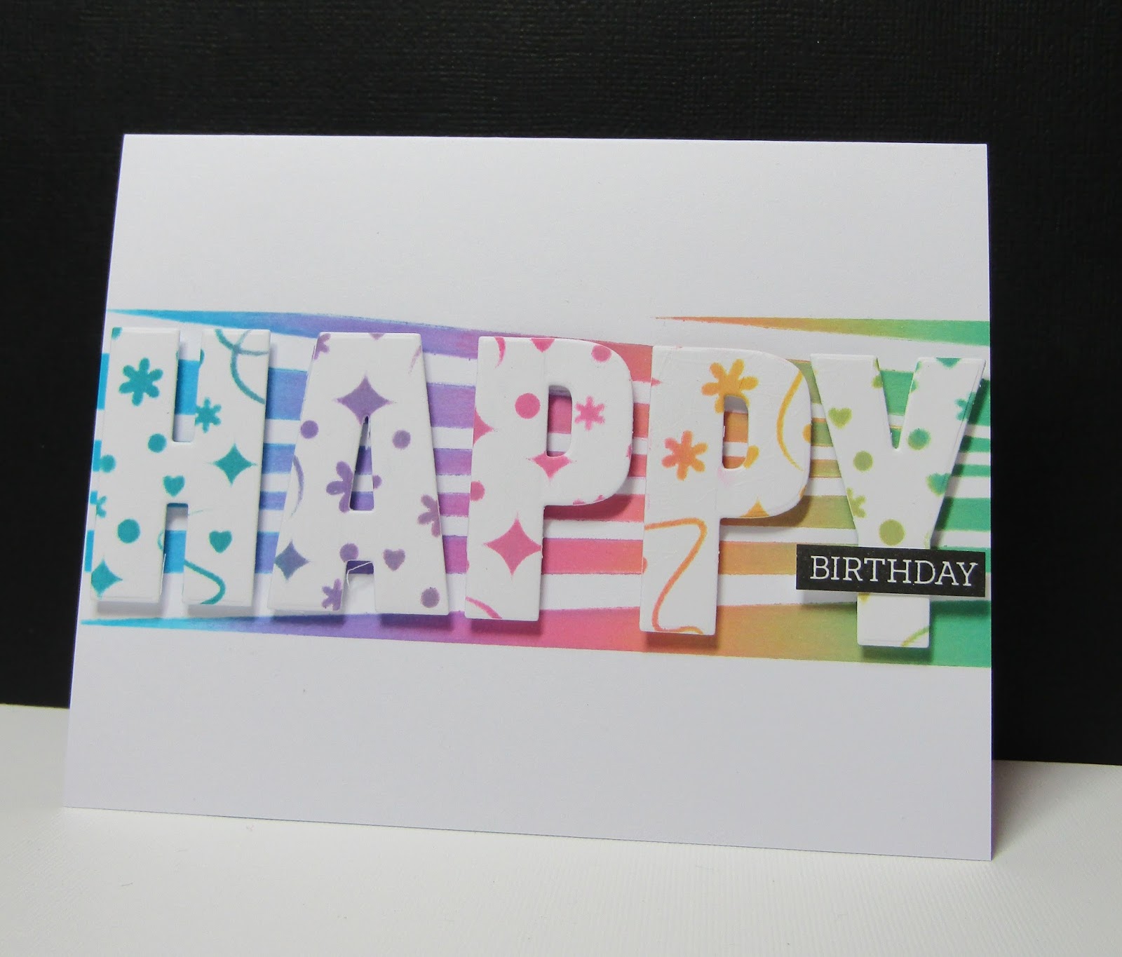 I inked through the confetti stencil in a rainbow of colours and then cut it out using Altenew's bold alpha dies. I inked through Uniko's Wonky Stripes stencil on the card base and popped the letters on top of it.