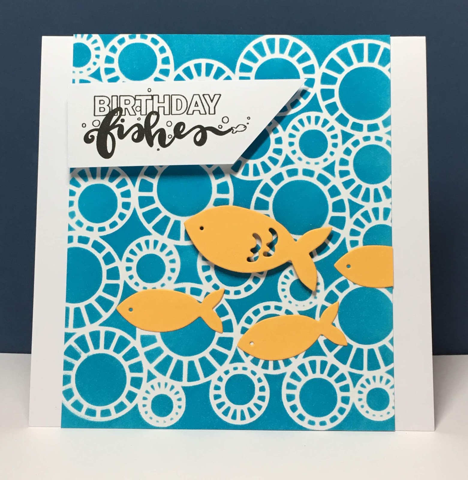 I simply inked through the stencil with Mermaid Lagoon Distress Oxide ink - it comes out so crisply.  I combined the background with some cute fish dies from Sizzix and a lovely sentiment from Sticker Kitten's current Mermaid Treasures collection.