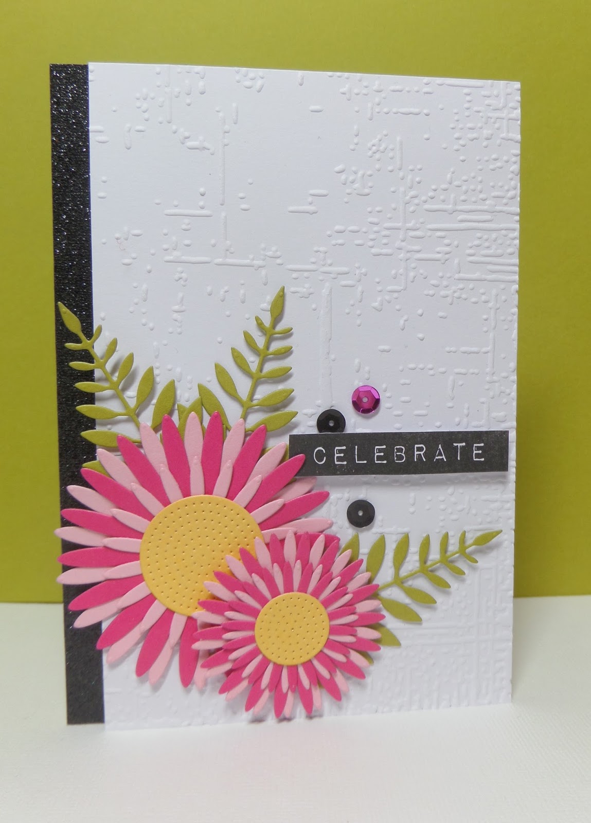 Earlier in the week I used texture paste and this time I used an embossing folder to add texture. I don't have many but like the way it gives the white card panel a bit of a lift. I combined it with my new MFT gerbera dies (love!) and the foliage is a Memory Box die (I think). The sentiment is from Altenew and I added a strip of black glitter card down the side which adds a bit more texture.