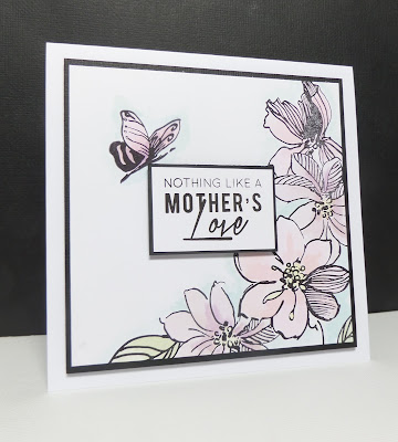 I masked and stamped the florals around the corner on the first card and watercoloured with very pale colours to create a soft, washed out feel. I will link this card up at Time Out's current word inspiration challenge - Love is the flower you've got to let grow.