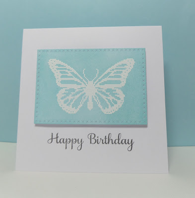 A simple final card where I have white embossed a butterfly stamp from Waltzingmouse and inked over that in tumbled glass distress ink. The sentiment is from Hero Arts.