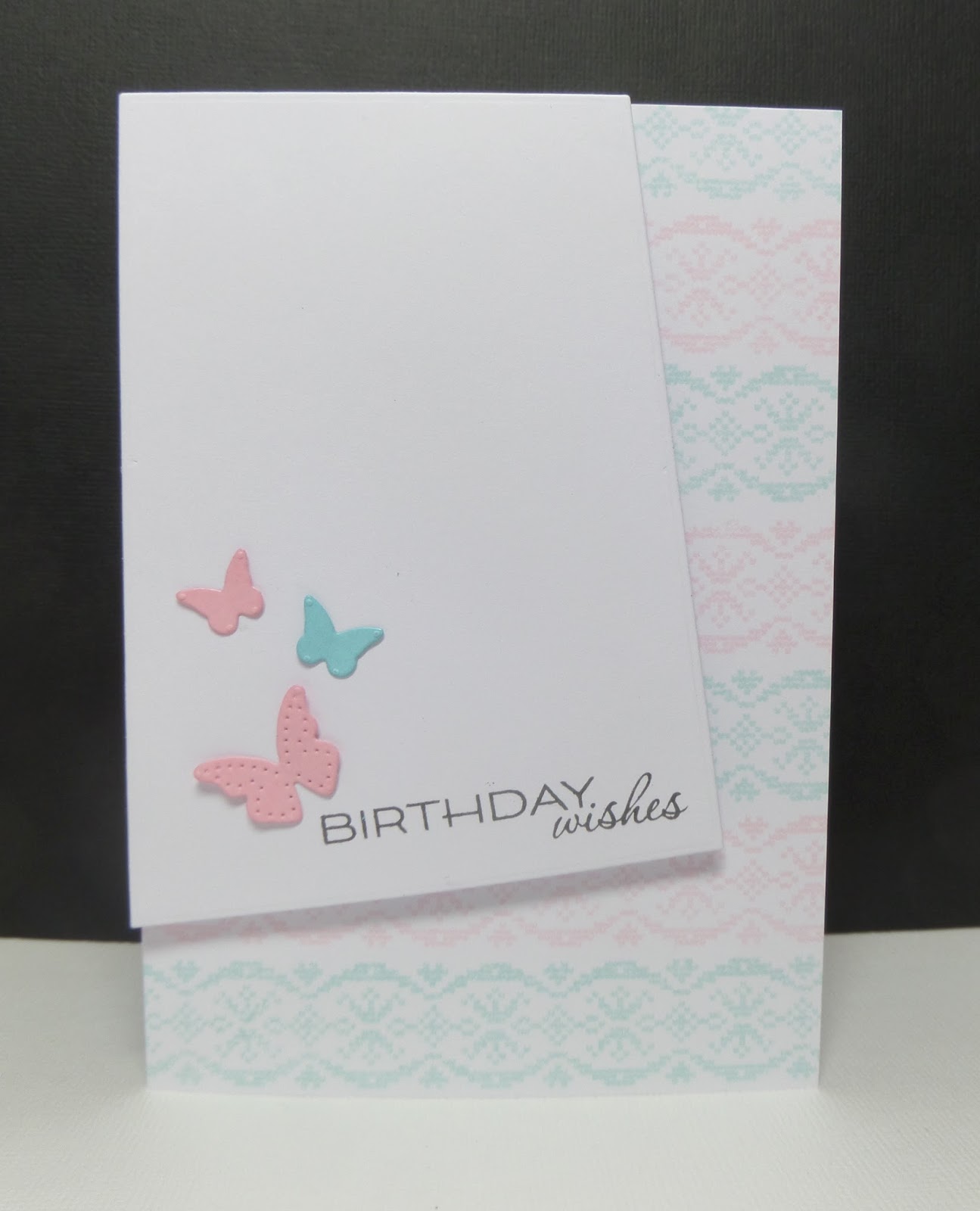 I stamped a lace border stamp from Waltzingmouse Stamps in light blue and pink to create a background on the card base. An angled panel on top of that features the sentiment (Waltzingmouse) and a few MFT die cut butterflies.