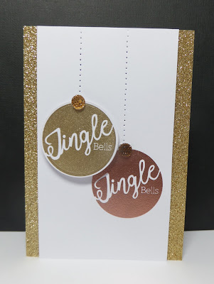 I used Uniko's Christmas Labels set to emboss the circle in gold and copper to create two ornaments with some gold glitter tape at the edges and a pierced line to create the effect of them hanging down the front of the card. I like the metallic colours and touches of festive bling :)