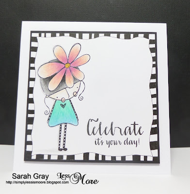 My second card features a whimsical cartoonish girl coloured in pencils. I added a doodled border to go with her stripey legs!