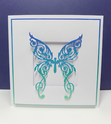 I inked up some card stock in a range of distress inks from Blueprint Sketch through to Cracked Pistachio and die cute the ornate butterfly. I created a white frame and popped it up over a border inked with the same colours as the butterfly. I decided not to add a sentiment to the card so that I can use it for any occasion. I love the soft floaty feel that the butterfly gives! I shall also link this card up to Simon's Wednesday Challenge where the theme is Clean and Simple.