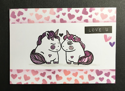 I masked a strip on the kraft cardstock and used That's Crafty paste over the Confetti Hearts stencil and combined it with this loved up pair of Chubby Unicorns. The sentiment is from WPlus9.