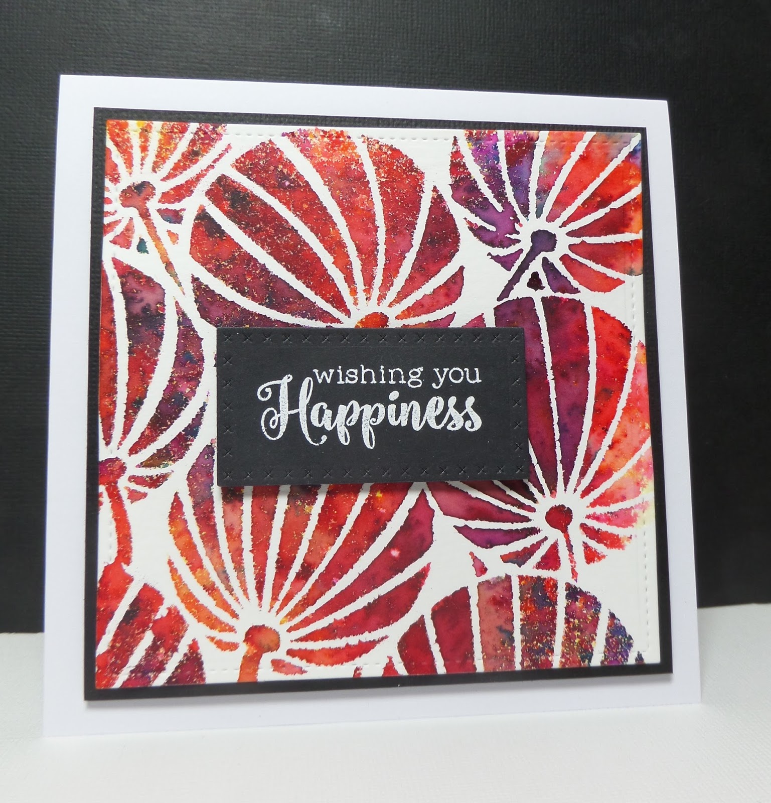 I am just popping in with a few cards that I made over the Christmas break playing with the colour bursts that I was given as a gift. I used them with a few of my lovely Clarity stencils and was pleased with the vibrant results: