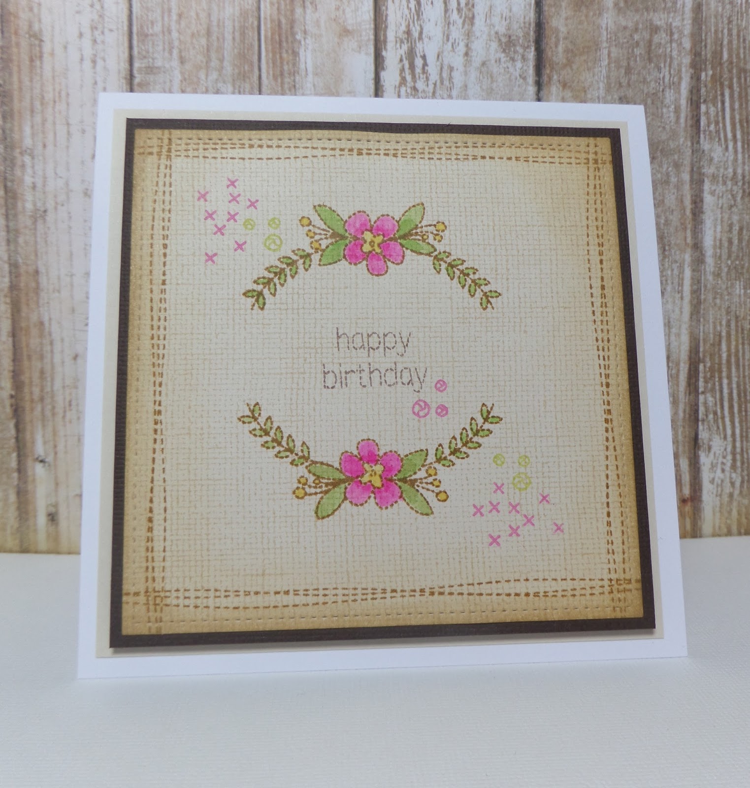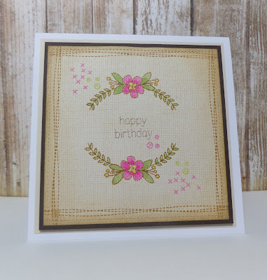 I used a new background from My Favourite Things to create the look of fabric on cream cardstock and some stitched stamps to create the border. The flowers and cross stitches are from a set by Lil Inkers and I watercoloured them using my Zig Watercolours. I have inked around the edge to emphasise the vintage, homespun look.