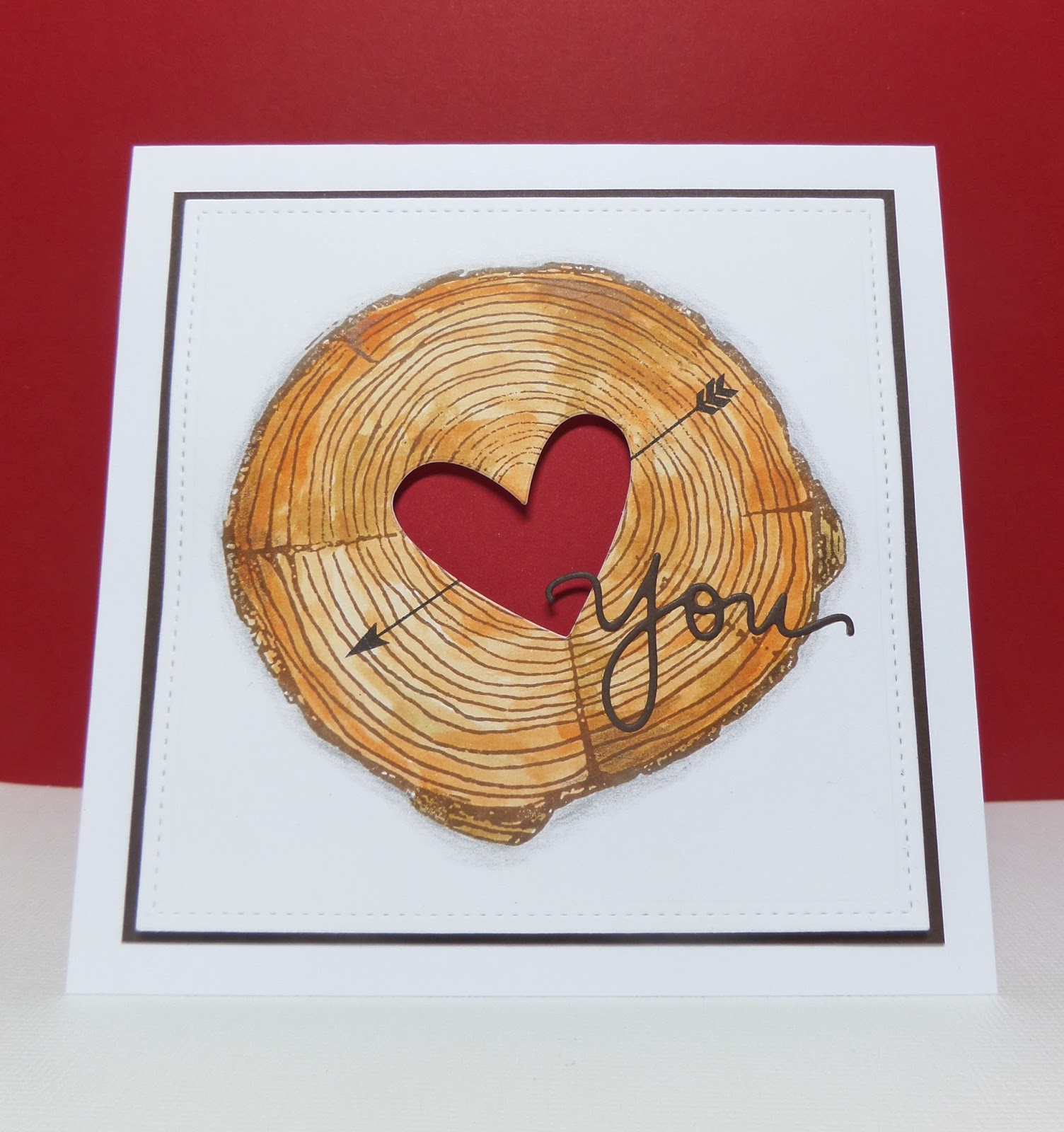 I stamped the gorgeous tree trunk and watercoloured with distress inks. I die cut a heart and combined it with a word die from Simon Says Stamp. A bit of pencil shading around the outside adds some depth. I really like how this valentine worked out as it isn't too pretty and will work for my hubby!