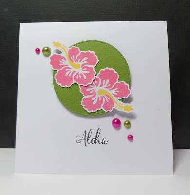I love the beautiful hibiscus flowers in the Paradise stamp set - they create instant impact. I simply stamped and cut out two of the flowers and mounted them on a circle of green card.
